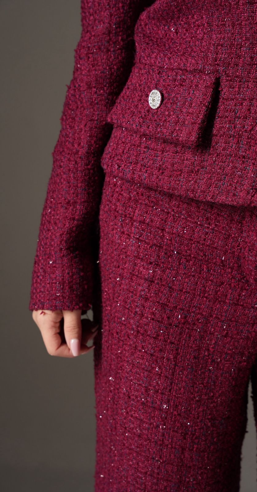 Elevate your wardrobe with this sophisticated burgundy two-piece suit set, crafted from a rich textured fabric that adds depth and elegance. The fitted jacket features structured shoulders, front pockets, and statement buttons that create a refined, polished silhouette. Its tailored cut enhances the waist while maintaining a classic, timeless look.