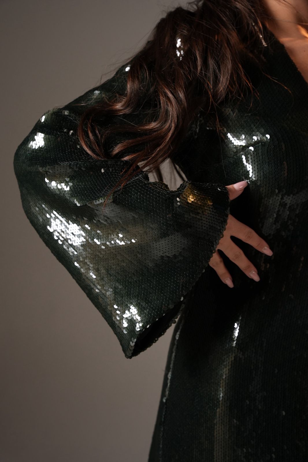 This mini dress is crafted from high-shine emerald sequins that capture the light with every movement, creating a sleek, liquid-like finish.