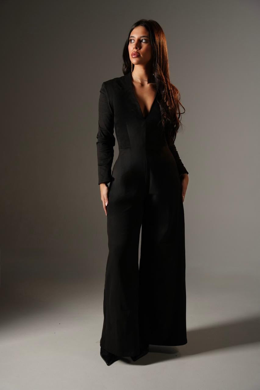 The black suede jumpsuit features a sleek silhouette, with a plunging neckline and wide-leg pants. The soft suede fabric drapes beautifully, while the tailored fit accentuates the figure. Details include a cinched waist, and a hidden zipper closure. The jumpsuit is versatile, easily dressed up with heels and statement jewelry or down with ankle boots and a leather jacket.